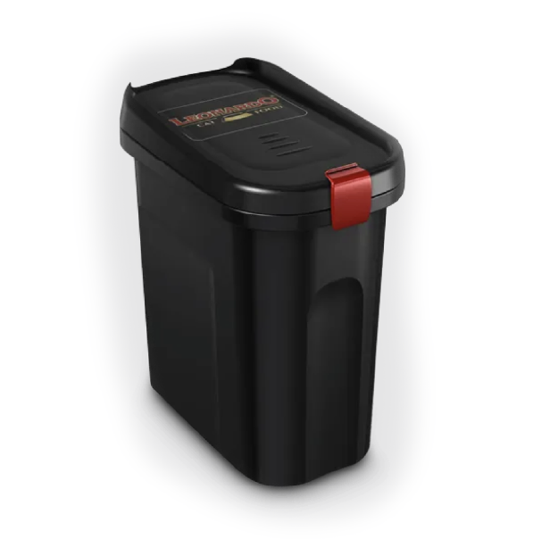 Fóðurtunna úr plasti, rúmar 7,5 kg af fóðri.