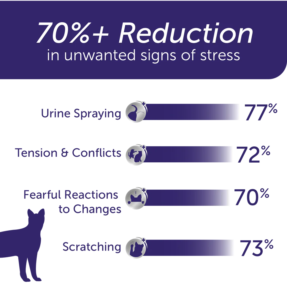 - After 1 month of use, cat parents observed positive changes, with a significant reduction in all of the signs of feline stress that were assessed.