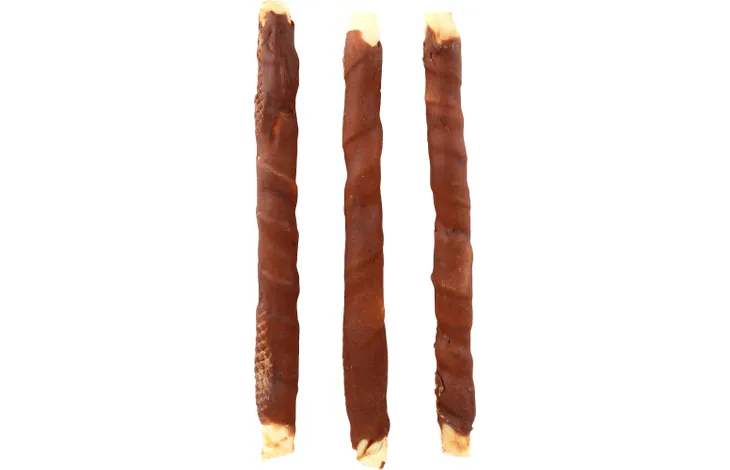 Þurrkuð nautshúð (rawhide) umvafið þurrkuðu kanínukjöti.