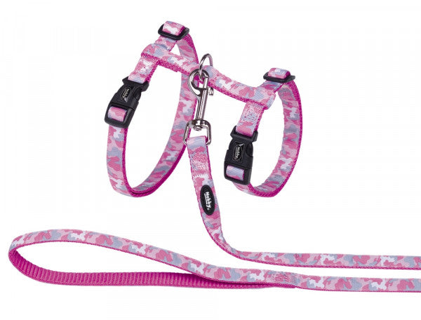 The new cat set XL "Camouflage" from Nobby is made of robust nylon and infinitely adjustable. In this set harness and leash is included (13 mm wide). The cat sets XL are available in 2 colors.