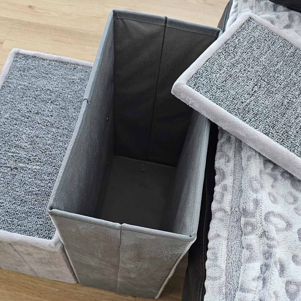 The ‘SCADA’ staircase offers a practical solution for pet owners who want to make life easier for small, sick or older dogs and cats. It comes in an elegant dark grey and is covered with a velvet-like fabric that offers comfort. The walking surface is fitted with carpet to ensure sure-footedness. The staircase is fully foldable and allows for space-saving storage. It offers storage space and allows pets to reach raised areas without straining their joints or backs. Integrated anti-slip studs provide additional safety.